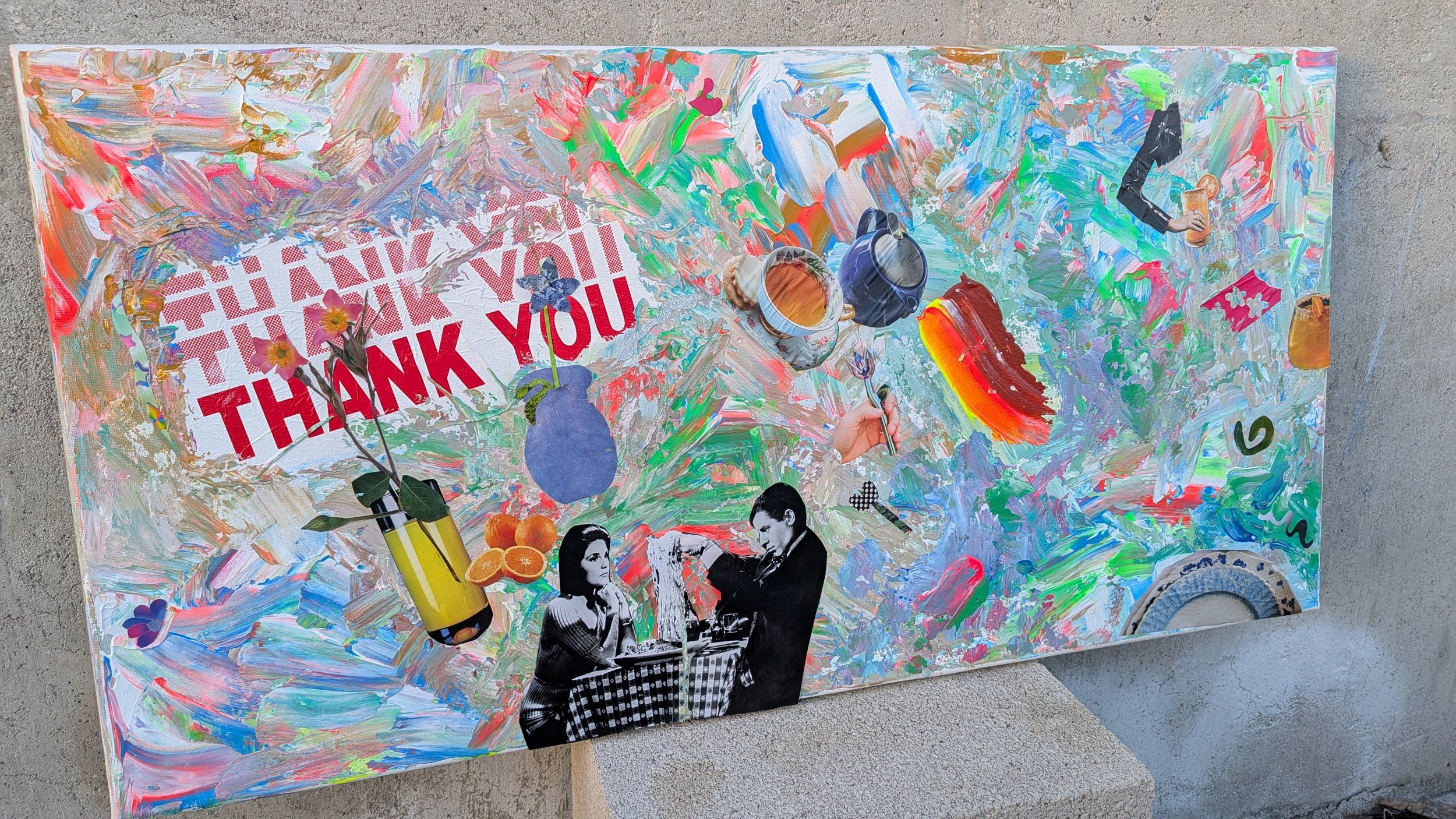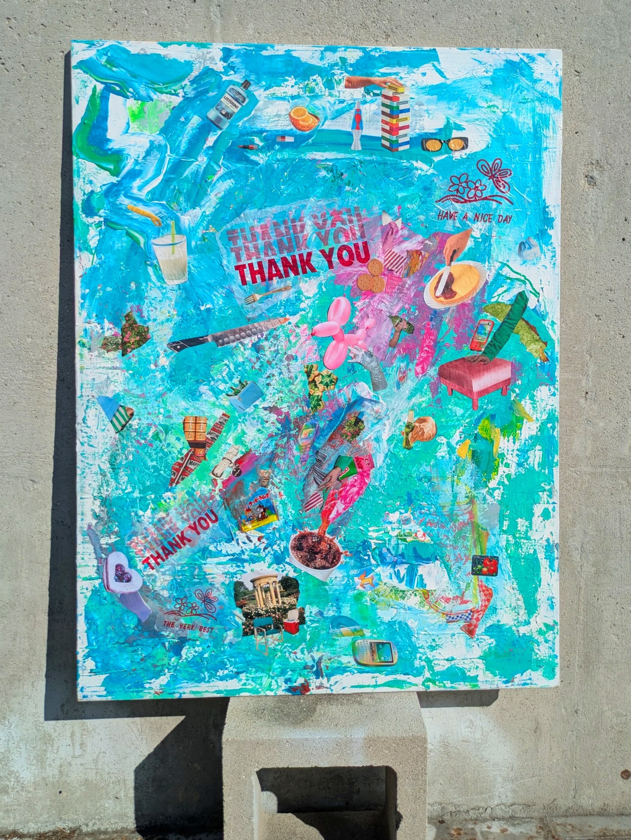 Toothpaste Dreams, 30” x 40”, acrylic paint and mixed media collage on canvas (magazine, calendar and cookbook paper, candy wrapper, plastic bag, sticker)
